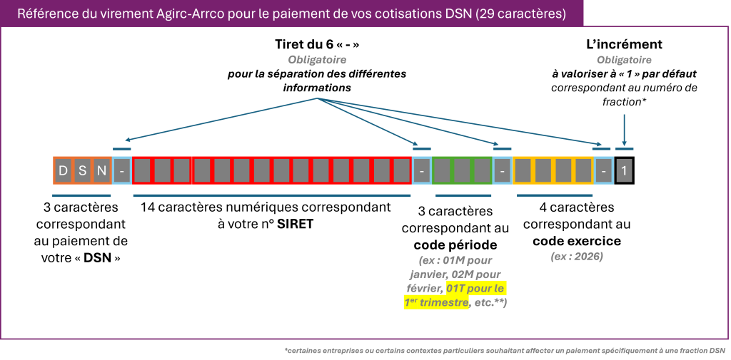 Exemple : pour le règlement des cotisations DSN du mois de janvier 2026 pour l’ensemble de votre entreprise, le libellé à utiliser serait : DSN-12345678901234-01M-2026-1
