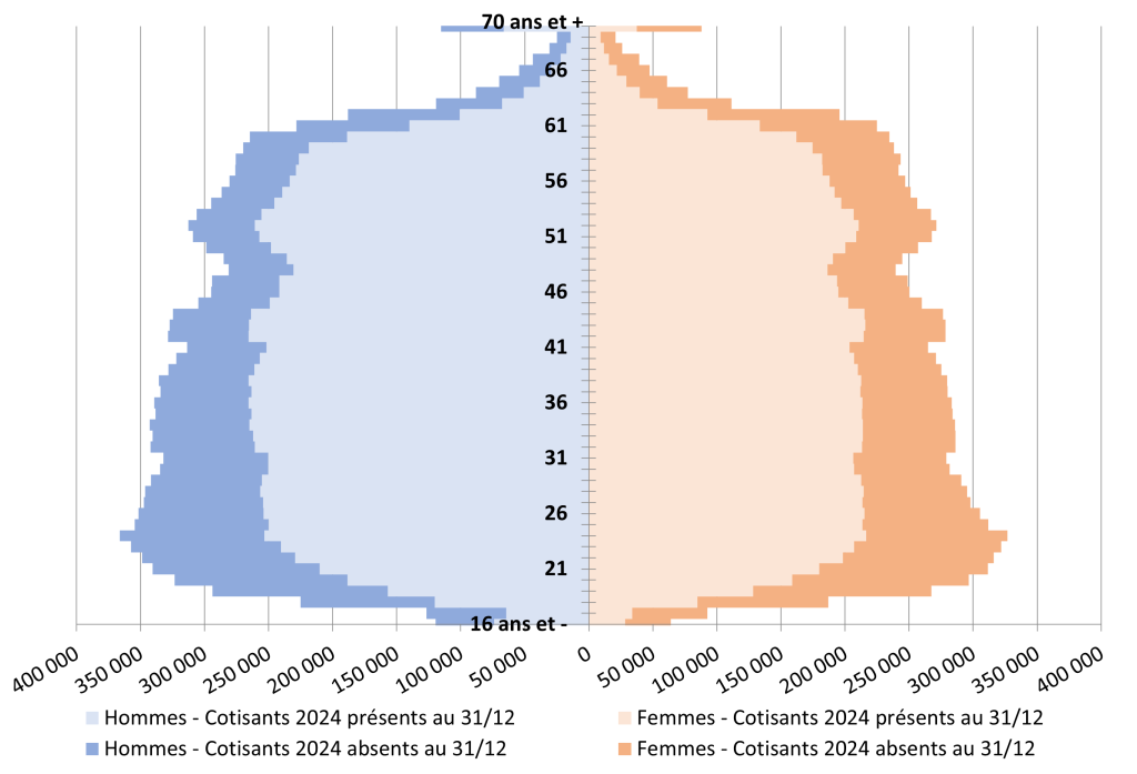 Au cours de l’année 2024, 27,6 millions d’assurés ont acquis des points à l’Agirc-Arrco, dont 26,1 millions au titre de l’emploi. En moyenne, ils sont âgés de 40,2 ans (40,3 ans pour les hommes et 40,2 ans pour les femmes). Les assurés âgés de 25 à 59 ans sont 20,6 millions, soit 74,5 % des assurés Agirc-Arrco.