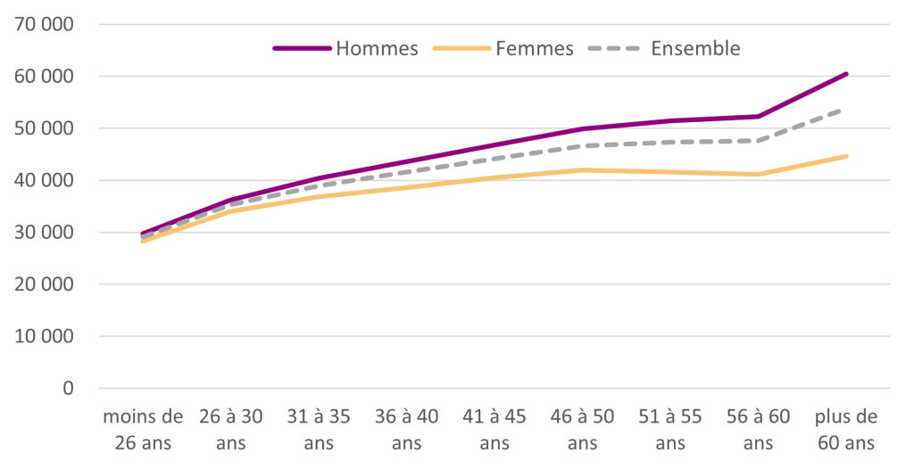 Note de lecture : En 2024, le salaire moyen annuel EQTP est de 40 448 € pour les femmes âgées entre 41 et 45 ans, contre 46 735 € pour les hommes de la même classe d’âge.