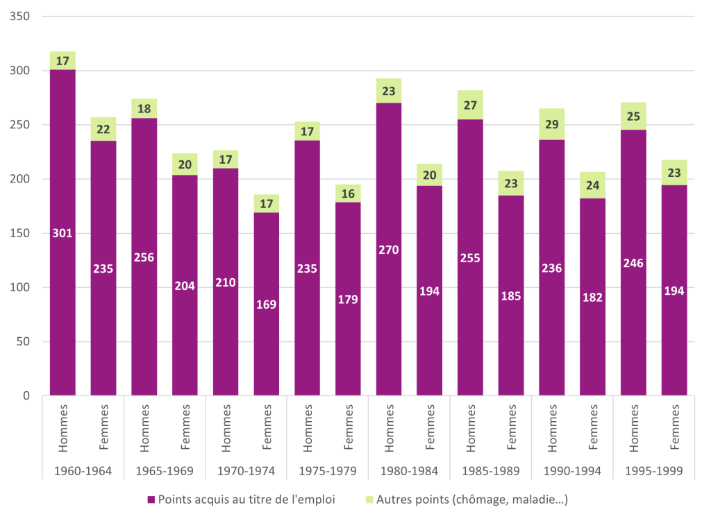 Note de lecture : Les hommes nés entre 1960 et 1964 ont acquis à 25 ans en moyenne 301 points au titre de l’emploi et 17 points hors emploi (chômage, maladie, maternité, invalidité…).