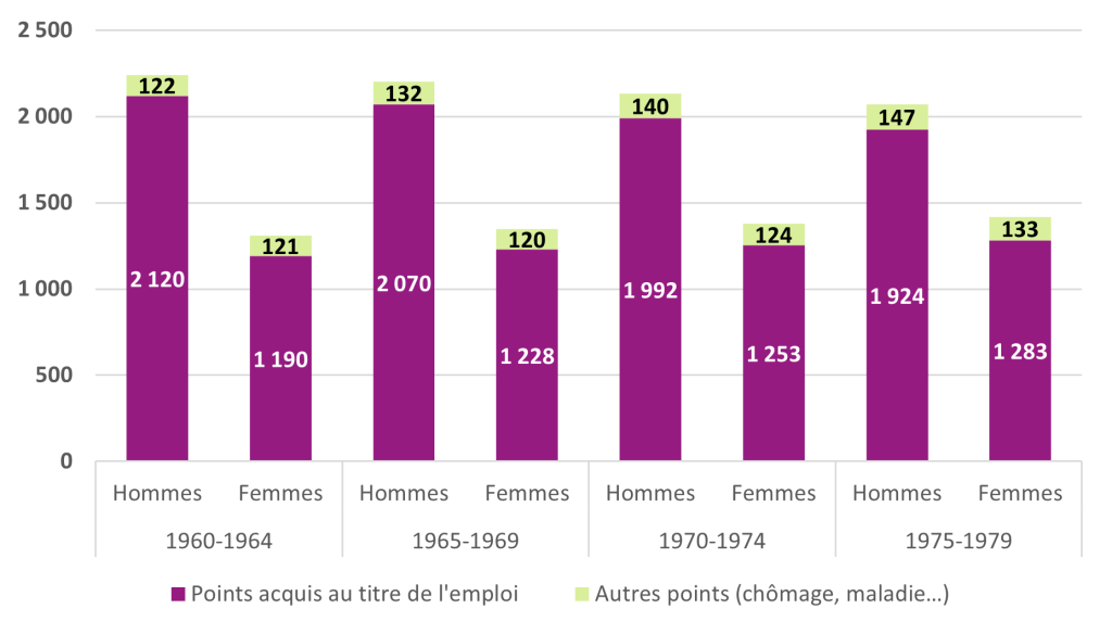 Note de lecture : Les femmes nées entre 1960 et 1964 ont acquis à 45 ans en moyenne 2 120 points au titre de l’emploi et 122 points au titre du chômage, de la maladie ou autres.